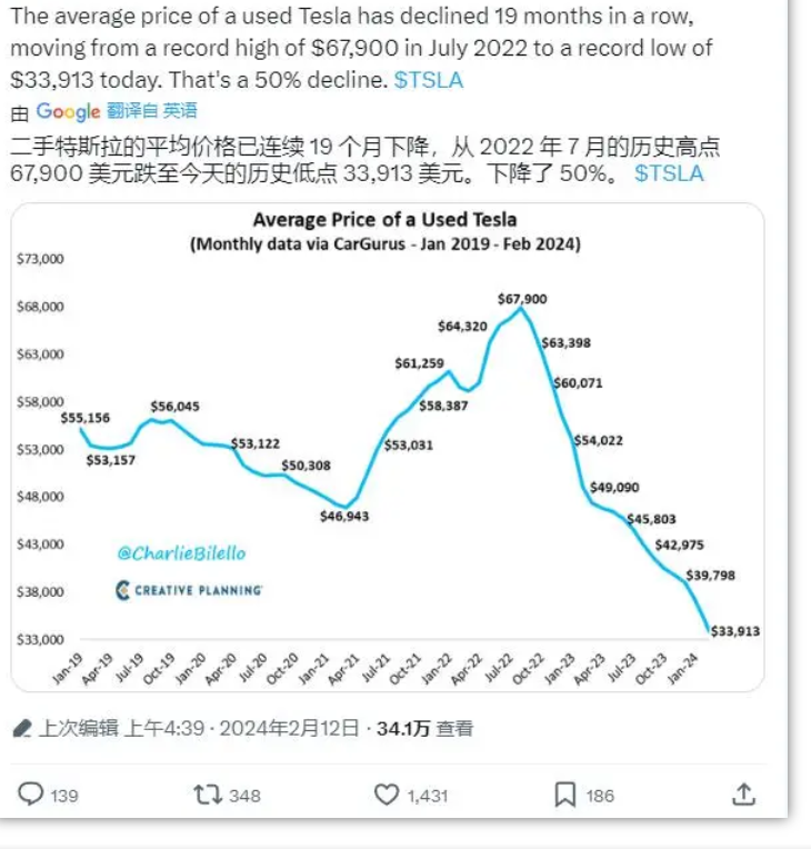 美国二手特斯拉汽车价格连续19个月下降,降幅达50%