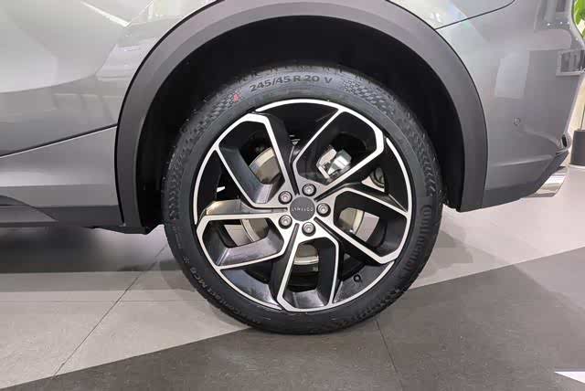 轮辋采用了20英寸的铝合金多边形五辐式设计,匹配了马牌的MC6系列轮胎,规格为245/45R20。这款轮胎主打的是一个静谧性、抓地力,可以带来更好的胎噪表现和制动效果。