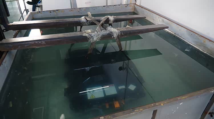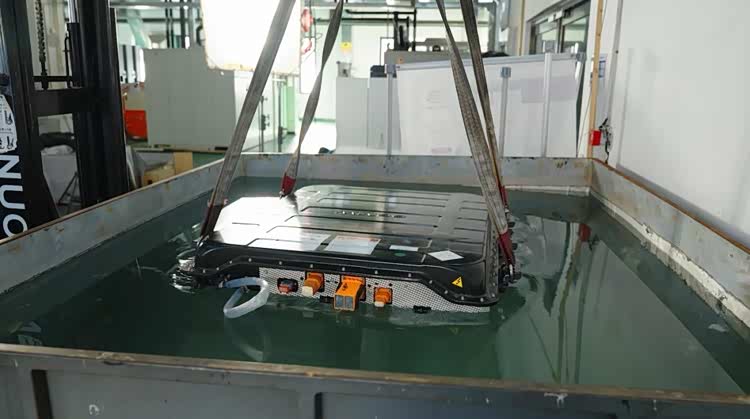 “神炼电池”已经在一米深的浸水池里面浸泡了两个多小时。我们可以看到水面依然是比较平静的,没有反应的气泡在上面产生,而且水质也是是比较清晰的,也说明没有电解液泄漏。现在我们就把电池从水中拿出来。这几个电口都是干燥的,说明这块电池接口处的密封是完全没有问题的。把表面的水擦干后,拆下SMC材料的面板,整个的电池里面是干燥完好无损的,电控各方面的系统也没有进水的现象。同时,整个的电池的工作是正常的。