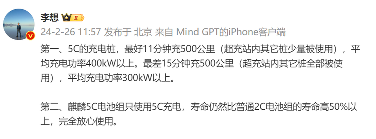 由宁德时代研发的麒麟电池(三元锂)在装车之后究竟能达到多高的充电效率,在不同的场景中又能达到什么标准,这两个问题困扰了不少MEGA的准车主;理想汽车的李想给出了准确答案,这套极限可达到7C充电的动力电池方案配合5C充电桩最低可实现3C标准。