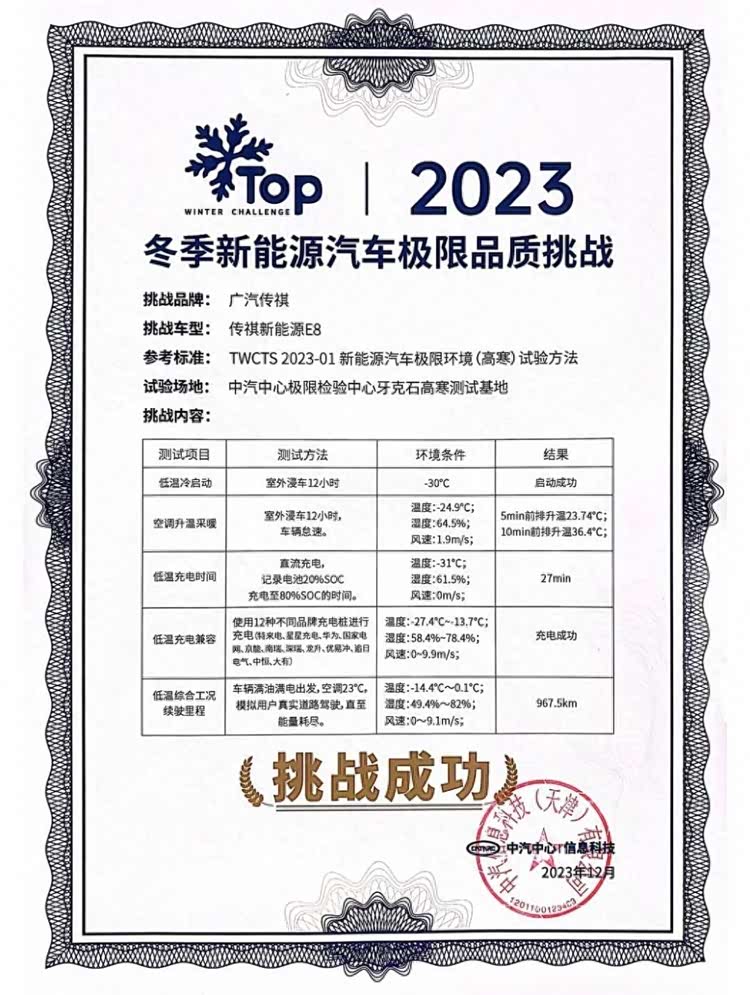 测试地点在内蒙古呼伦贝尔牙克石地区,室外温度维持在零下14.4℃~0.1℃,车内空调调至23℃,在正常路况测试后,传祺新能源E8的真实续航里程为967.5公里。所以这台车的续航能力,在中国绝大部分地区的寒潮天气下,都可以说完全没问题。