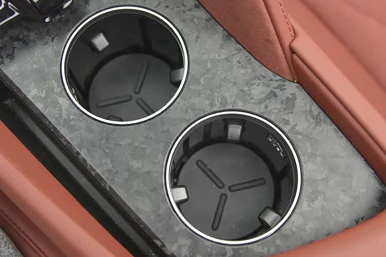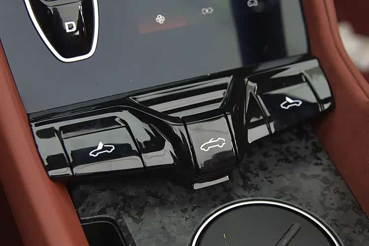 全系都是翻毛皮混搭的皮质座椅,翻毛皮使座椅的摩擦力更好,比较适合跑车。虽然坐垫填充有些硬,但包裹性不错,对于身体非常贴合。不过,坐姿相对偏高,没有跑车那种低矮感,可能是因为电池,导致地板厚度增加的原因。
