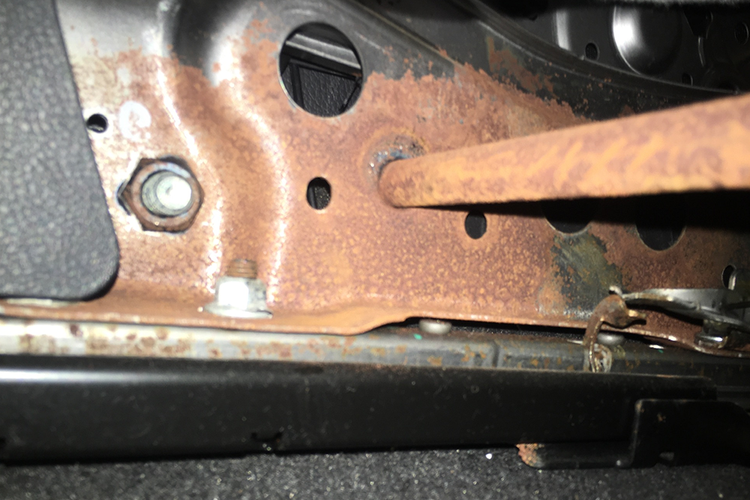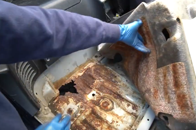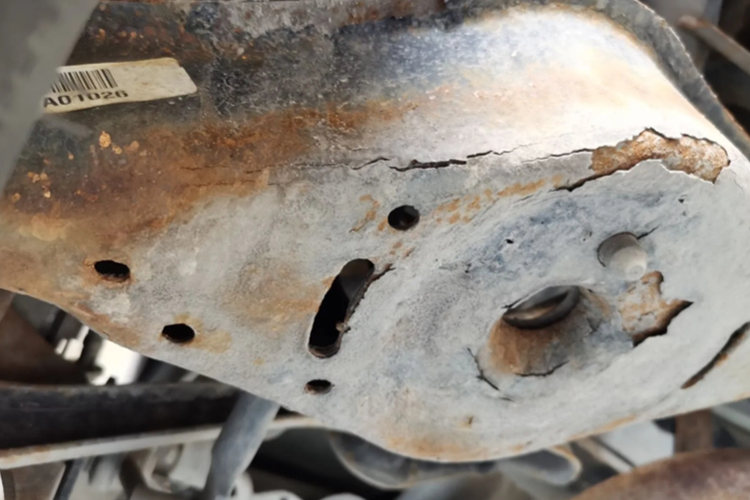 第三级别,影响安全,必须马上处理。主要是车身结构件和底盘件,包括我们前面说的整个白车身,还有硬派越野车的大梁,以及摆臂、连杆、车架等等。结构件和底盘件作为保障安全行驶的关键部件,车企通常会给予最大限度的防锈喷涂,但是日常使用中事故和磕碰难以避免,一旦这些部位受损生锈,必定会带来结构强度减弱。大家看那些老车修复的视频,很多车子在事故后又使用了很长时间,地板和后备箱等比较薄弱的部位直接锈穿,变成破洞,开着开着车一屁股坐到地上,可不是开玩笑的,像A柱、B柱、纵梁这样的部位也在生锈之后失去强度,基本上一撞就散架。
