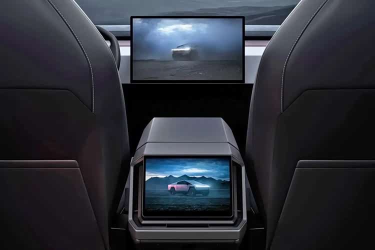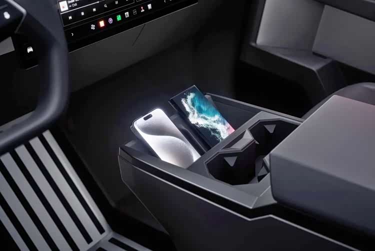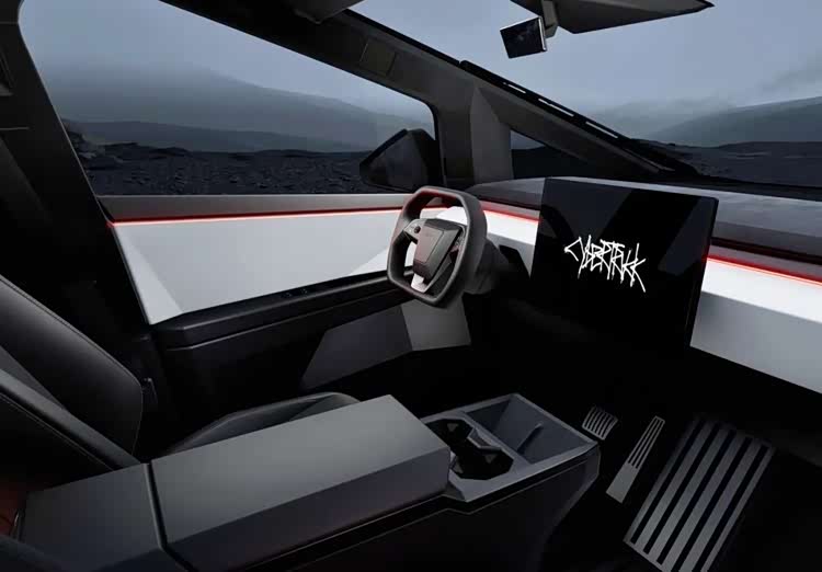 虽然巡展现场不能进入车内,但透过车窗我们也能看到车内的布局,整体简洁的风格和特斯拉在售车型差不多。内饰充满了硬朗的直线条和弯折,连座椅和方向盘都以直线条为主,与硬朗的外观和谐统一。简洁的仪表台正中是一块18.5英寸大触控屏,在中央扶手尾部还有一块9.4英寸的触控屏供后排乘客使用。智能驾驶方面他配备hw4.0最新自动辅助驾驶硬件,支持完全自动驾驶能力。