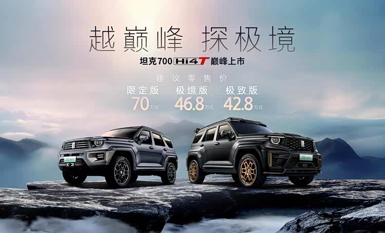 越巅峰,探极境,中国豪华越野旗舰坦克700 Hi4-T于2月26日巅峰上市,坦克700 Hi4-T限定版建议零售价70万元,极境版建议零售价46.8万元,极致版建议零售价42.8万元。以巅峰技术成就极致体验,以极致探索承载无限热爱,坦克700 Hi4-T打造全球豪华越野新标杆。