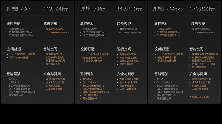 其中,2024款理想L7 Air车型升级包括魔毯空气悬架Pro、SPA级十点座椅按摩、下沉式中央储物格、双腔远端安全气囊、高通骁龙8295P、RGB+IR视觉模组、双麦阵列式麦克风。在Air车型基础上,Pro车型将标配智能冷暖双用冰箱、铂金音响系统和AD Max。在Pro车型基础上,Max车型将标配52.3kWh大电池增程系统、高通骁龙8295P高性能版、后舱娱乐屏和21英寸轮毂。