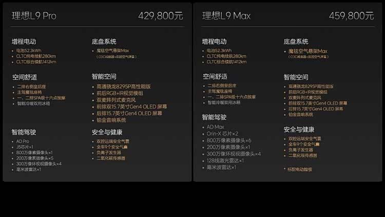 2024款理想L9,家庭六座旗舰SUV。全系标配52.3kWh大电池、魔毯空气悬架Max,二排右侧皇后座、主驾魔毯座椅、一排二排SPA级16点全身按摩、铂金音响系统、高通骁龙8295P高性能版、第四代OLED屏幕。理想L9 Max在L9 Pro车型的基础上将标配AD Max和电动踏板。