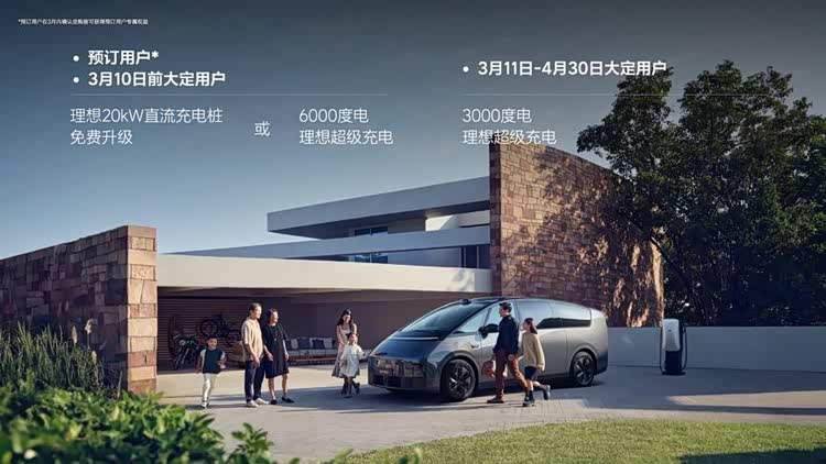 此外, 3月11日前确认定购的用户,可享受免费升级20千瓦直流充电桩或6000度电的理想超充权益。用户在3月11日至4月30日确认定购,将享受3000度电的理想超充权益。