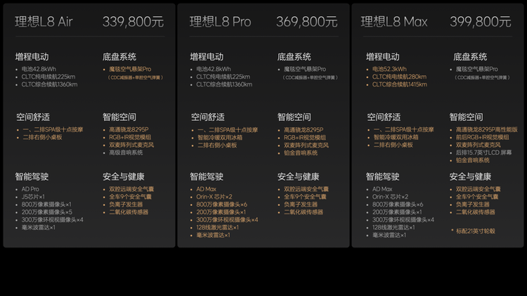 2024款理想L8 Air车型升级包括魔毯空气悬架Pro、SPA级十点座椅按摩、二排右侧小桌板、双腔远端安全气囊、高通骁龙8295P、RGB+IR视觉模组、双麦阵列式麦克风。在Air车型基础上,Pro车型将标配智能冷暖双用冰箱、铂金音响系统和AD Max。在Pro车型基础上,Max车型将标配52.3kWh大电池增程系统、高通骁龙8295P高性能版、后舱娱乐屏和21英寸轮毂。