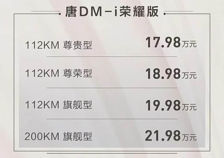 唐DM-i荣耀版纯电续航112km的有3个版本,而200km的有1个版本。