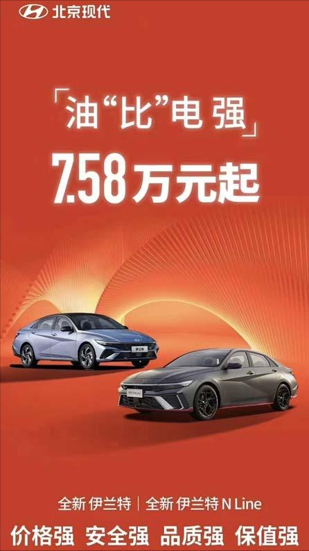 那这一次他们就把旗下的伊兰特售价调降至7.58万起售,对比降价前9.98万的售价直接低了2.4万,让到它的售价比比亚迪秦Plus DM-i更便宜一点,更是打出【油“比”电强】的标语,重点直接突出了其中的“比”字,其中的挑衅意味不言而喻。
