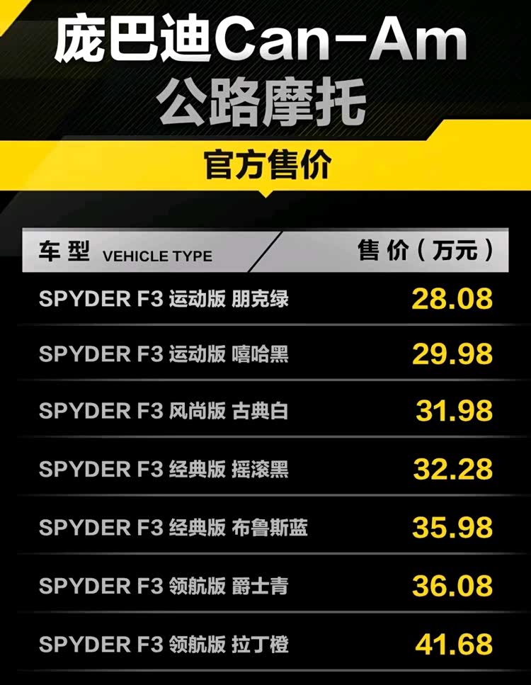 在庞巴迪动力的新品发布会上,新款全地形车、公路巡航摩托以及摩托艇等产品的精彩亮相吸引了无数目光。特别是2024款庞巴迪Can-Am Spyder F3系列公路摩托车正式上市,并推出7款不同颜色和配置的版本,官方价格为28.08万-41.68万元。新车凭借其独特的设计和先进的配置,成为了公路巡航摩托车市场的一颗新星。