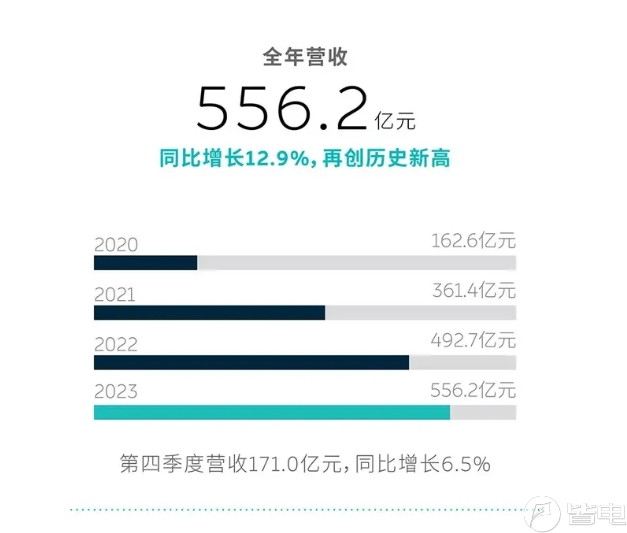 数据显示,蔚来汽车2023年第四季度营收171.032亿元,同比增长6.5%。2023年全年营收556.179亿元,同比增长12.9%。