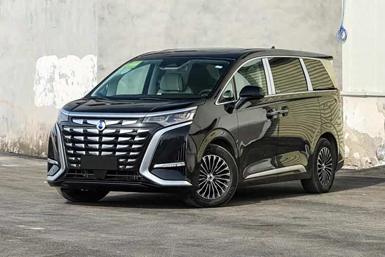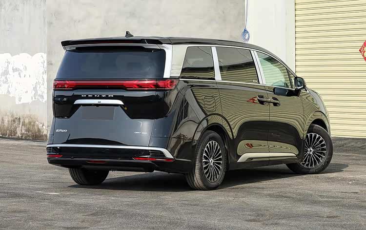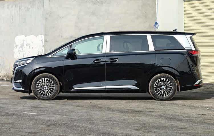 车身侧面整体造型很舒展大气,上宽下窄的银色装饰D柱造型有着很高的辨识度,腰线使用了前低后高的上扬式折线造型,车门下部带有银色饰条。尺寸方面,腾势D9的长宽高分别为5250/1960/1920毫米,轴距达到了3110毫米。