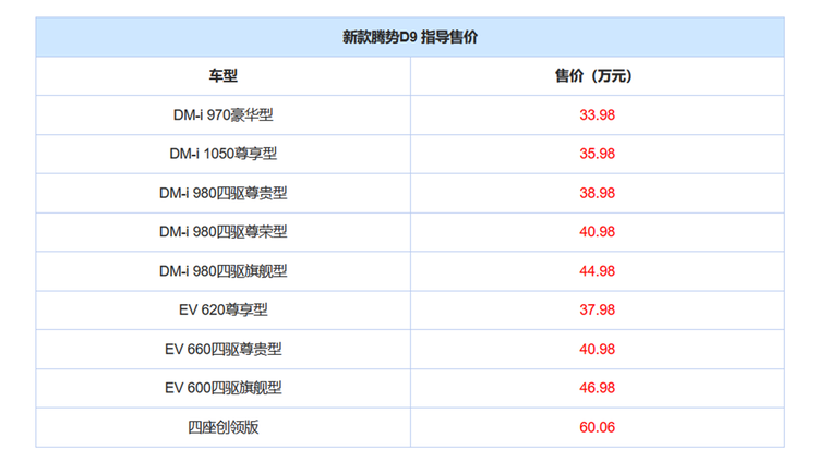 3月6日,新款腾势D9正式上市,新款车型继续提供插电混动和纯电动两种动力,配置上进行了升级,价格则是相比老款有所下降,其中起步价下调了1万元,整体价格区间为33.98-60.06万元。