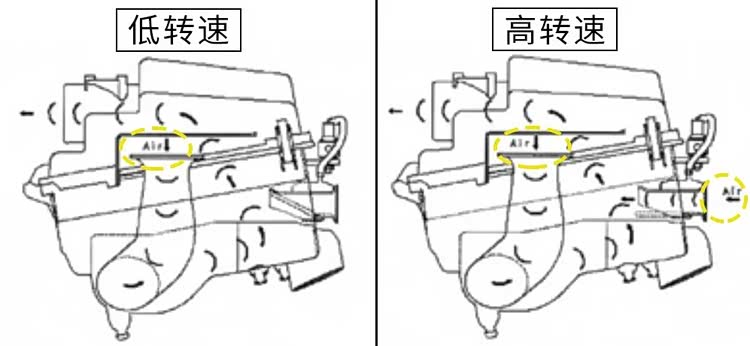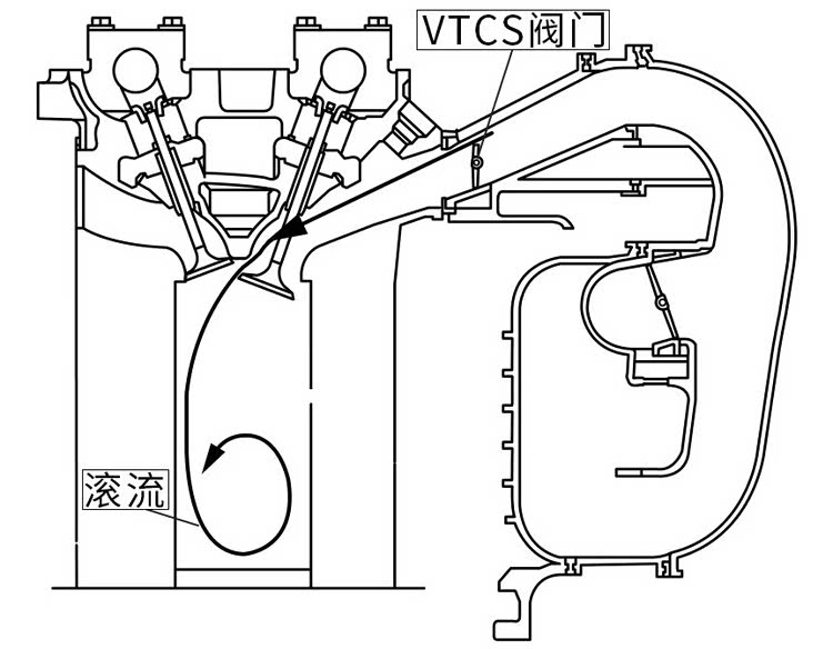 至于比较少见的VTCS进气滚流控制、VAD可变空气导管倒是值得聊一聊。具体来说,VTCS系统是在进气歧管的底部安装了一个阀片,当这个阀片关闭时,通过进气歧管进入气缸的有效横截面减少,因此空气的流速增加,并在气缸内形成较大的滚流,而滚流对于油气混合、燃烧都有巨大的帮助。在马6上发动机转速只要低于3750rpm,VTCS系统的阀片就会关闭,即便此时发动机的进气量不够大,空气也能在气缸内产生较强的滚流。