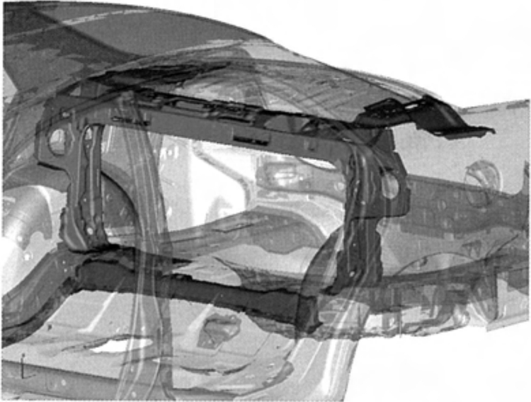 其实,马6在开发之初就格外重视操控稳定性,它的开发团队曾在内部试验场内将马6跟同级竞品进行了比较。如上图所示,在车辆以100km/h车速转动方向盘时,马6(也就是日本的ATENZA)的方向盘操作角度、方向盘操作力度、车身的横摆角这三条曲线之间的时间差是非常小的,这意味着在驾驶者转动方向盘时,车身响应就已经跟上了节奏,同时驾驶者还能从方向盘上得到不错的路感反馈。相比之下,那个年代的同级竞品(EC Competitor)跟马6的差距就比较明显了,三个参数之间存在较大的时间差。那么马6出色的操控能力又是如何实现的呢?具体来说,在开发马6时马自达应用了许多新测试方法,并发现车身变形对操控稳定性影响非常大,而且马自达还对同期竞品进行了摸底,得出的结论和之前相同,那就是操控好的车都具有不错的车身刚性。但是车身刚性可以分为整体,也可以分为局部,车身哪些地方的刚性对操控影响最大呢?
