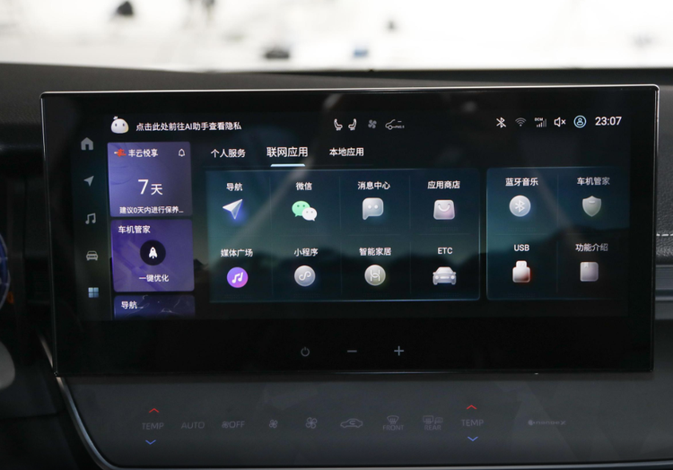 当然,对于预算充足的消费者来说,尊贵版及以上车型则是更佳选择,因为尊贵版、运动版,以及运动PLUS版中控均搭载12.3英寸液晶仪表盘和12.3英寸中控屏,并内置8155芯片、HUD抬头显示系统,车机流畅性、响应速度更出色,除车联网、OTA升级等基础车机功能外,还配备声纹识别、语音控制系统、微信等主流应用,以达到行业主流水平的智能表现,实现智能化用车体验。