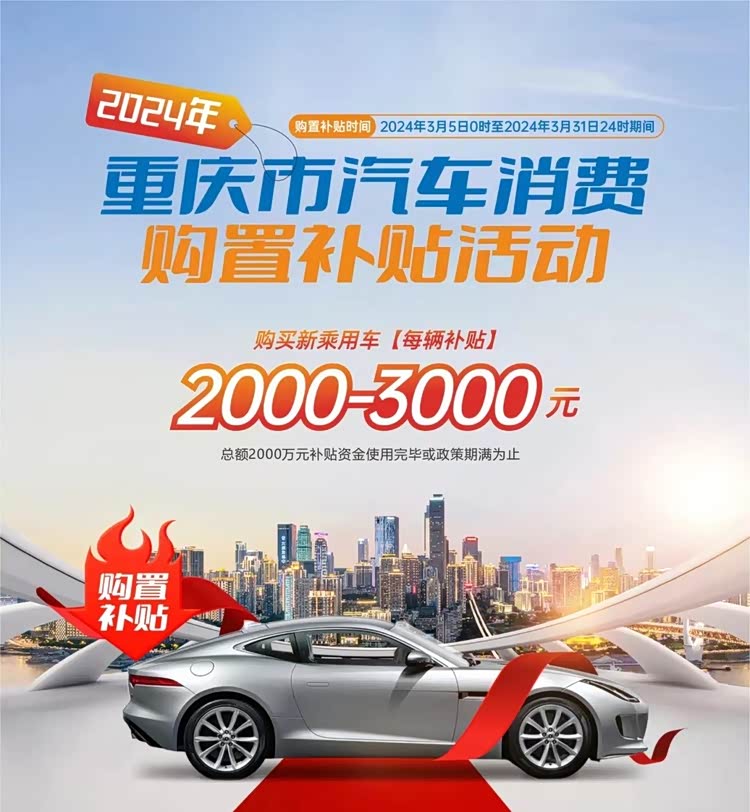 2024年3月5日0时至3月31日24时期间,重庆市商务委开展2024年汽车消费购置补贴活动,本轮补贴政策资金规模为2000万元。