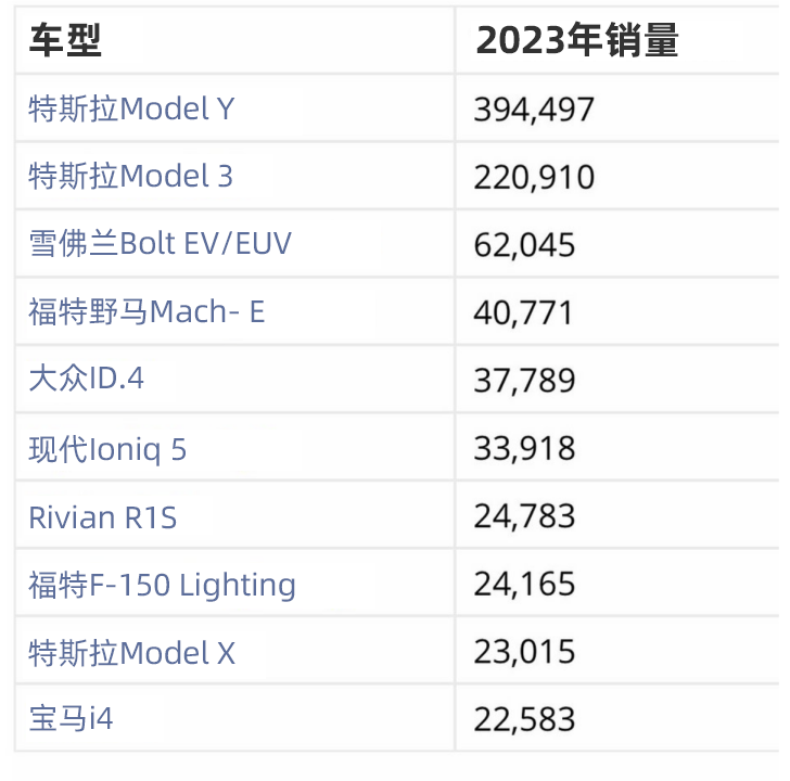 2023年,美国一共卖了接近120万辆纯电动车,渗透率为7.6%,其中特斯拉占据一半多的市场份额。最畅销的车型,Model Y和Model 3以394497和220910的销量位列前两位,通用汽车的雪佛兰Bolt和福特野马虽然紧跟其后,但62045辆和40771辆的销量,却和“榜一”大哥拉开了一大截距离。