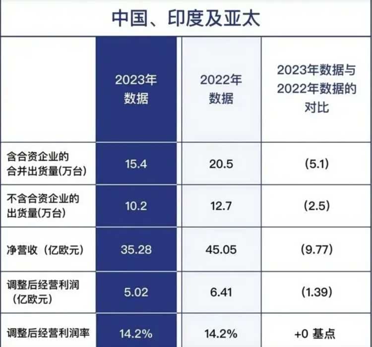 中国、印度及亚太市场无论是营收还是销量,都排在最末,15.4万辆(含合资)的销量贡献了35.28亿欧元营收。该市场也是Stellantis6个板块中唯一一个营收下降的市场,同比2022年下降了21.7%。