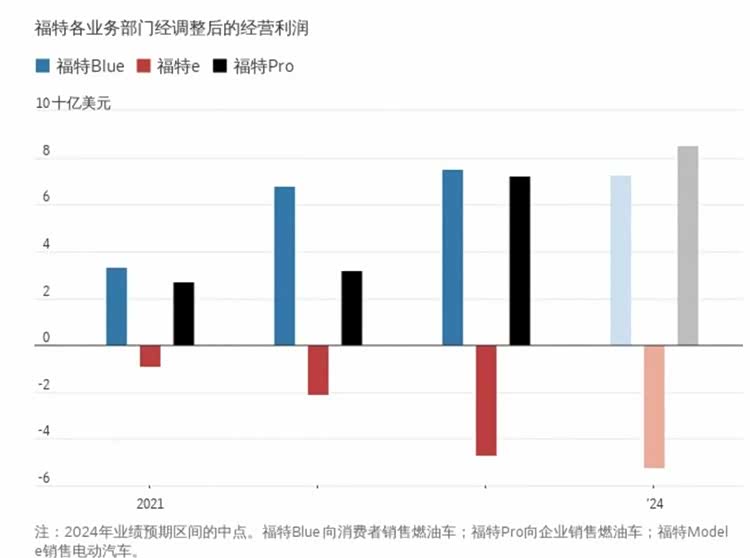 福特的电动部门Model e销售了11.6万辆,则亏损了47亿美元,今年预计亏损还将持续扩大,约在50亿-55亿美元。《华尔街日报》报道称,如果福特不再销售野马Mach-E和F-150 Lightning车型,不再投资新一代产品来替代它们,那么调整后营业利润会高出50%。