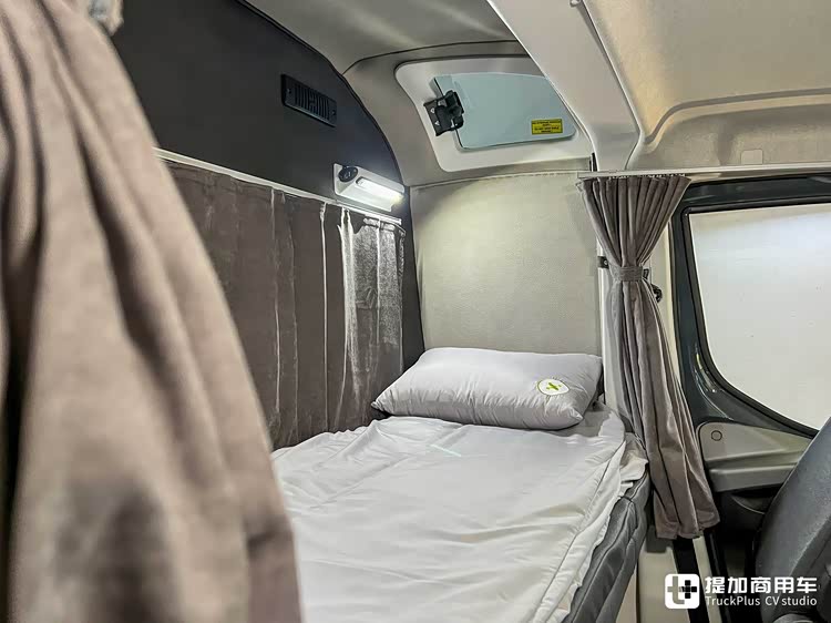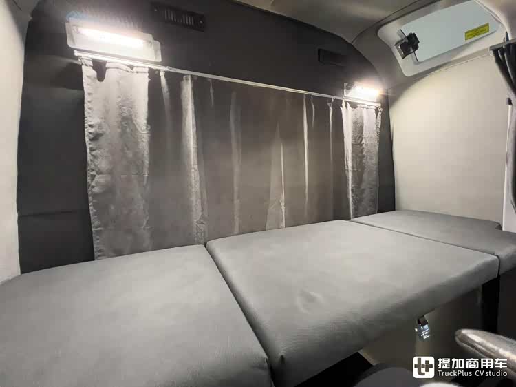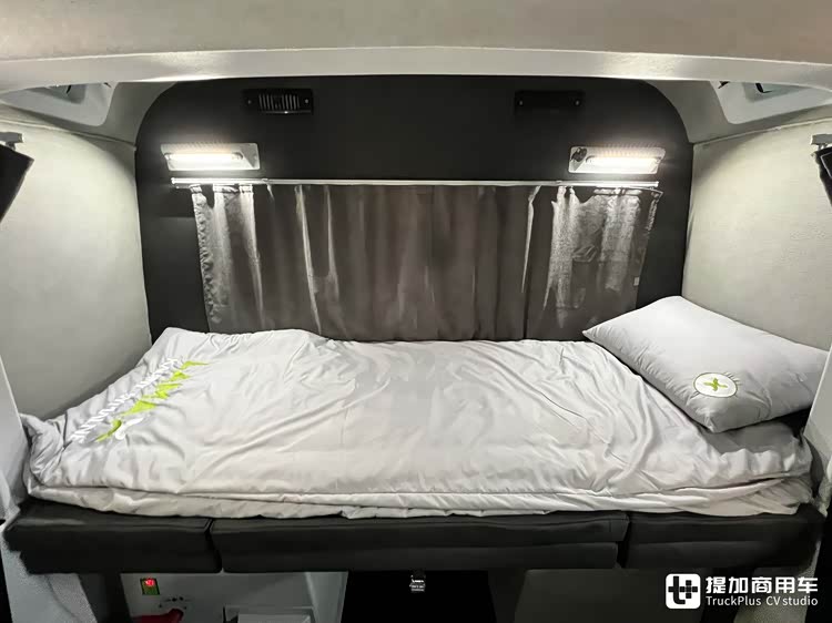 驾驶室后部区域为卧铺舱。在这里,LAMAX设计了一张大尺寸的翻折床。它平时翻折收纳在生活舱后壁上,睡眠时翻折下来,便可变为一张较为舒适的床铺。