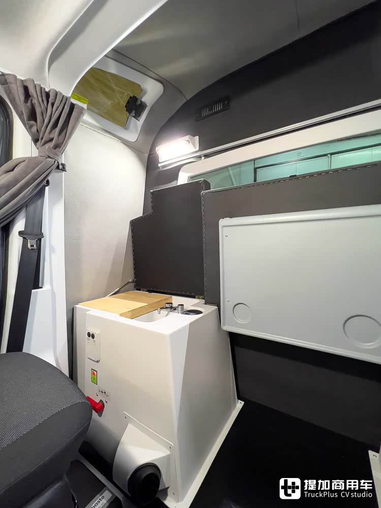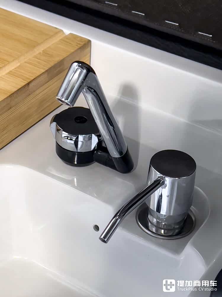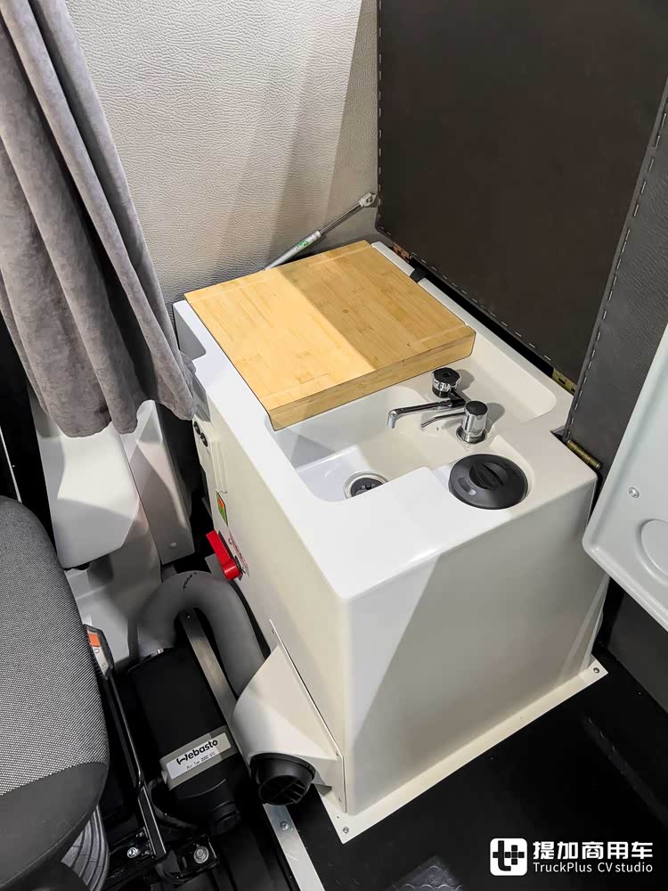 橱柜设计有集成水槽及卡式炉,可满足驾驶员的简单烹饪需求。卡式炉盖板由木材制成,既能够拿来切菜,也可以拿来用餐。