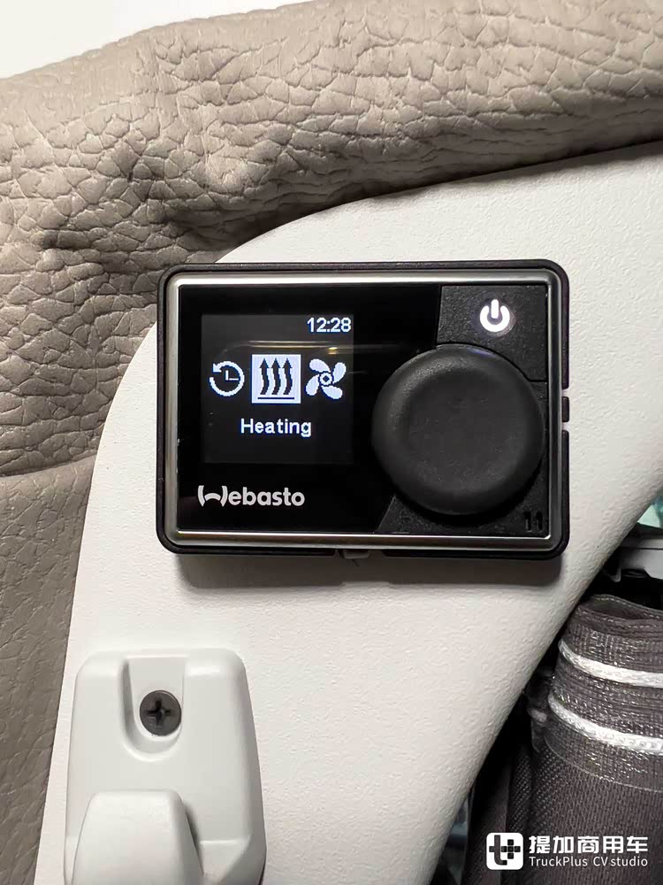 针对寒冷地区的过夜需求,车内还安装了伟巴斯特柴油暖风热水一体机,用作驻车空调,还能提供热水使用。
