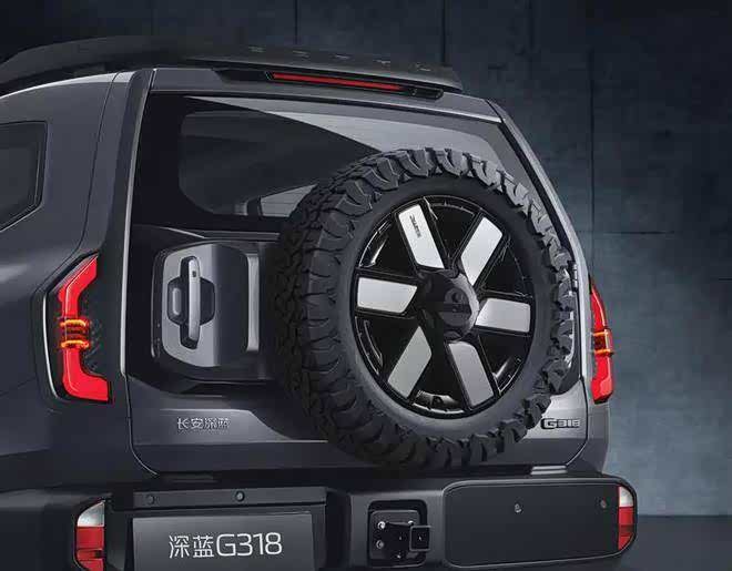 车尾部分,深蓝G318以“太空之门”为主题,尾窗玻璃与下方黑色件构成主体,同时两侧体量延申交汇形成一个托举结构,设计独特且富有创意。C字形能量晶体尾灯与前大灯相呼应,尾灯组的造型更加立体而富有力量感。此外,新车还采用了硬派越野车常见的“小书包”设计,并通过侧开式尾门结构提升了装载能力。