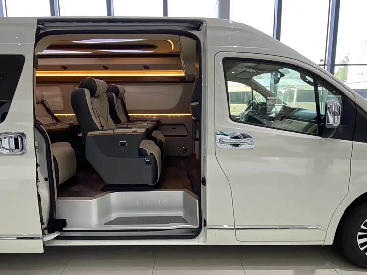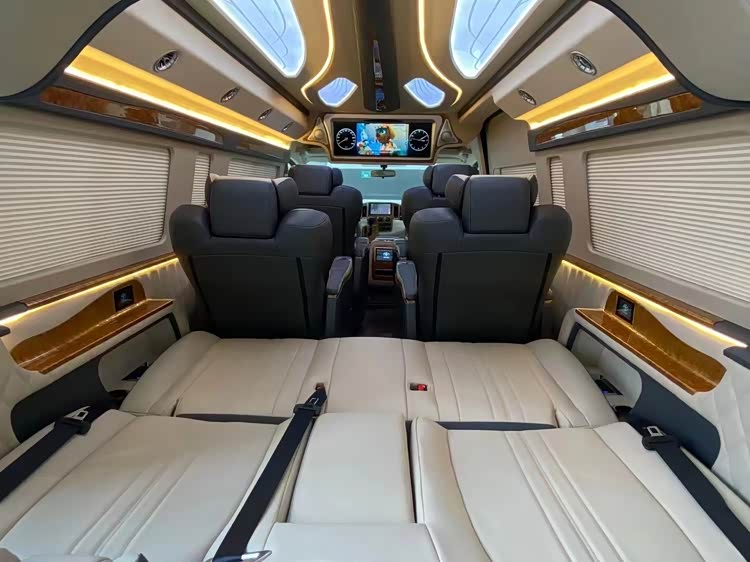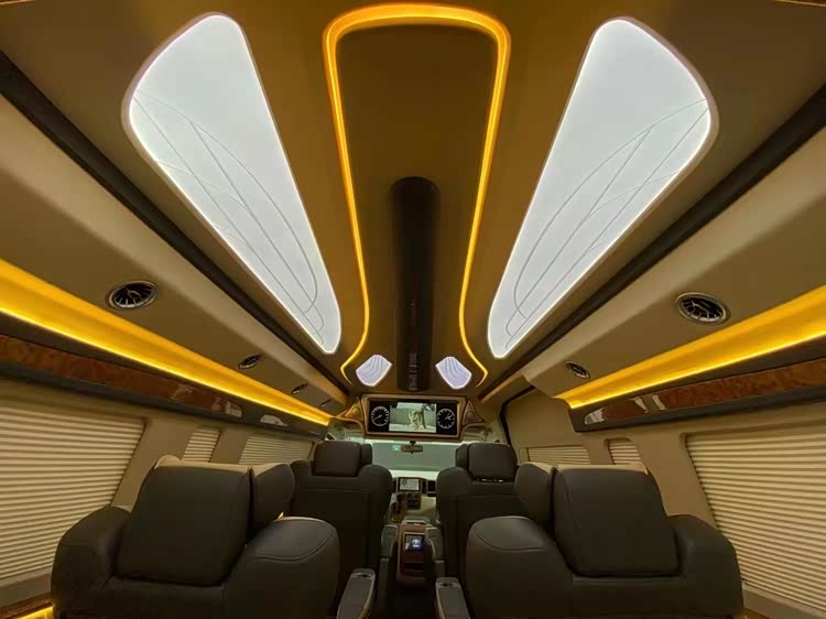 侧壁菱形格的设计使整车层次分明立体感更强。侧窗豪华电动窗帘,面料阻燃隔热、隔光、隔音。顶棚更换意大利顶级麂皮绒零污染零伤害的环保材质,搭配桃木件及氛围灯的组合,营造出温馨舒适的乘车环境。