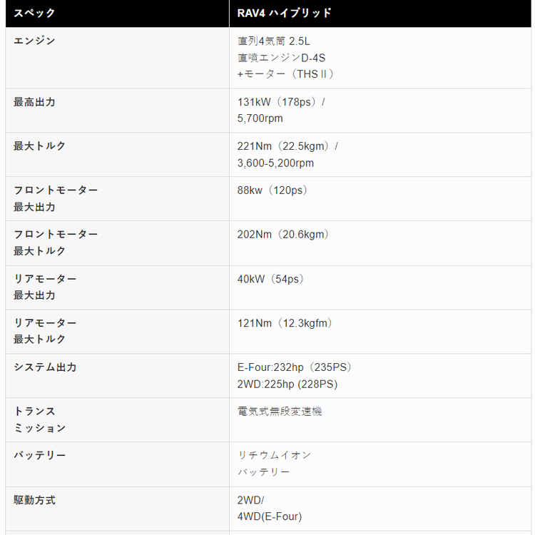 除此之外,新一代RAV4/威兰达还将采用改进的TNGA(丰田全球新架构)TNGA-K平台,提升车身刚性,从而提高乘坐舒适性。第五代混合动力系统将采用效率更高、且改进了软件的大型电机的THSⅡ系统。2025年上市的新款丰田RAV4将采用2.5升直列四缸发动机,并通过两个电动机增强性能。前轮驱动版本的总最大功率为225马力(228PS),而全轮驱动车型的总最大功率为232马力(235PS)。实际上,前轮驱动的RAV4在名义上是前轮驱动,AWD功能由后部安装的第三个电动机根据需要进行驱动。