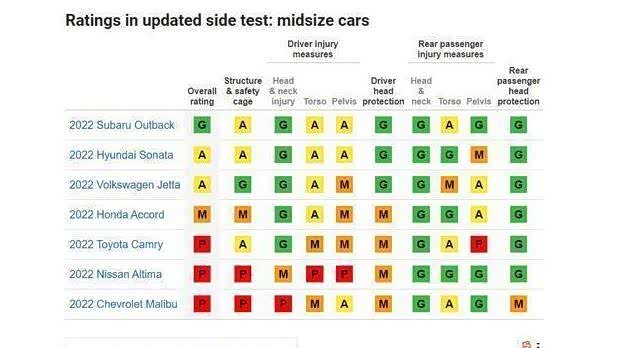 在这次IIHS的测试中,共有七款车型参与,包括斯巴鲁傲虎、现代索纳塔、大众捷达、本田雅阁、丰田凯美瑞、日产天籁和雪佛兰迈锐宝。这七款车型在之前的测试中均表现出色,名列成绩优秀车型的前列。然而,在新标准下,只有斯巴鲁傲虎获得了优秀的评价,凯美瑞则被评为最差的车型。