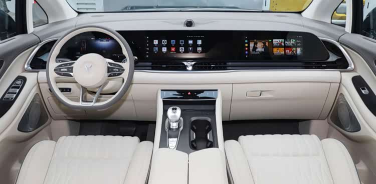 新岚图梦想家内饰设计灵感源于“游艇”设计。游艇档把造型,双拼皮方向盘,弧面中控台,将三块12.3英寸触控屏幕巧妙融合,搭载了高通骁龙8155车规级芯片,是全场五款车型中唯一支持5G车联网的车机,上网速度更快,后期OTA更方便,而且支持四区域语音识别,可见即可说。
