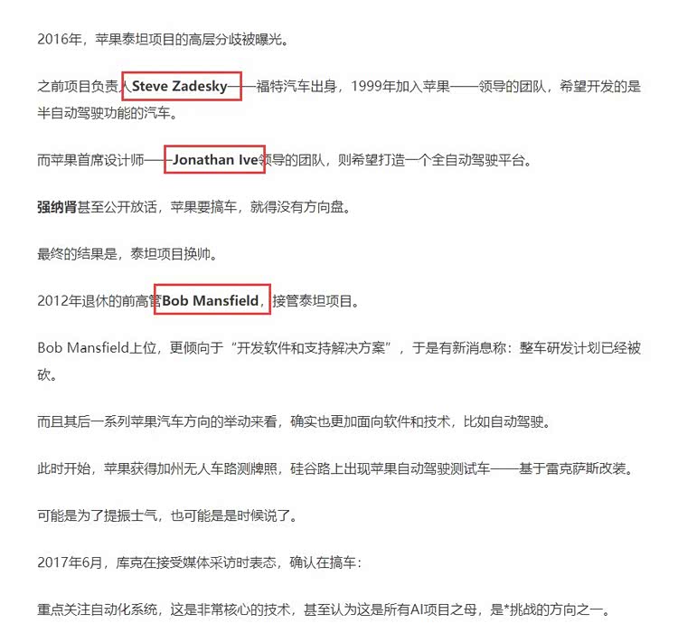 此时,摆在我们库克面前的,是一个投入几百个小目标,却丝毫见不到什么预期的超级吸金黑洞,库克也没办法了,不过,好在泰坦计划给苹果积累了一大堆算法工程师,苹果眼瞅着造车计划是推进不下去了,索性把项目一丢,把大量的工程师全部往AI方面转移,这就有了我们看到的苹果放弃造车计划,总之,苹果造车,眼光极其精准,投入巨大,却死于内斗。