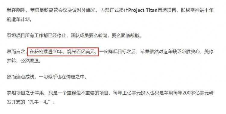 事实上,在我仔细查阅相关的外网资料后,发现这一切的背后,苹果造车失败的因素,恐怕并不是烧钱烧得还不够,因为苹果这样大手笔的企业,压根不差钱,根据此前披露出来的消息,苹果这个“泰坦计划”十年时间里面,光投入的资金量就达到了恐怖的百亿美元,隔壁雷布斯那100多亿根本不够看的,面对如此巨量的资金,给苹果带来的成绩,却是微乎其微,苹果转型也就再正常不过了。
