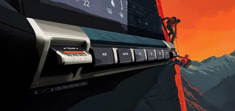 第二张图中,右侧的创意画面是2个极限攀登者,暗示新车的硬核攀爬能力也不言而喻。更显著的是位于新车中控大屏下方的一排空调系统实体按键,作为一辆越野车来说也体现了更多人性化。