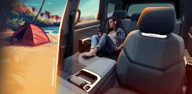 第五张图终于有美女出镜,画面氛围则更加轻松愉悦,但信息量也更大。车外是椰风海韵,帐篷搭在沙滩上,而拥有出色越野能力的深蓝G318则能够自由在沙滩上畅行。而车内的第一排座椅可以魔术放倒,几乎与第二排座位连接成纯平,美女悠闲的坐在后排座,一边听音乐一边玩手机,而第二排车门上还有USB充电接口。这样的空间拓展性和实用配置是相当令人期待了。