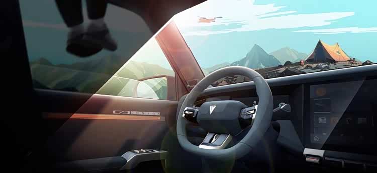 首先来看第一张图,远处是蓝天白云崇山峻岭,一顶橙色帐篷突显了车辆在野外的氛围。而车内带有深蓝logo的运动平底方向盘非常醒目,前方仪表屏和中控大屏连为一体,A柱和车门内侧的橙色内饰,加上镀铬饰条点缀,现代感十足。车窗外的一双腿,暗示车主正坐在车顶远眺大自然美景,暗示新车硬朗的车顶结构。