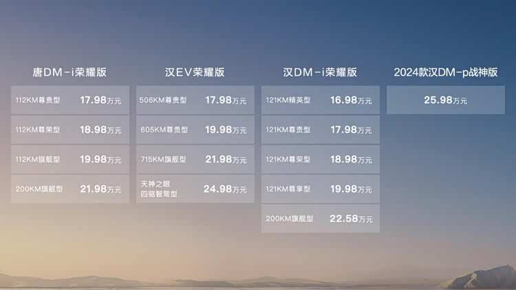 比亚迪汉EV荣耀版共4款车型,售价17.98~24.98万元;汉DM-i荣耀版共5款车型,售价16.98~22.58万元;2024款汉DM-p战神版共1款车型,售价25.98万元;唐DM-i荣耀版共4款车型,售价17.98~21.98万元。