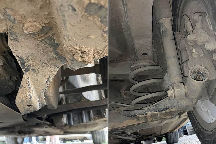 最后是底盘检测,这台车底盘检测下来主要三个问题,第一是托底,这个自然也是驾驶员的责任,车是无罪的,第二是车子底盘太脏了,全是土,像是越野去了。最后一点就是车子发动机下部在漏油,尤其是油底壳位置最为严重。