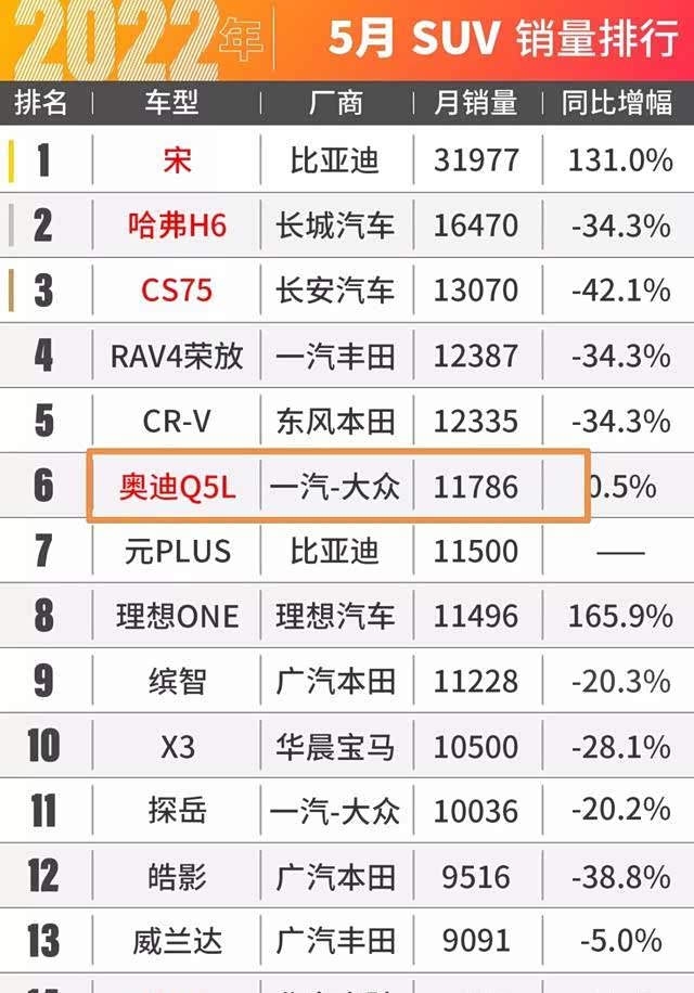 奥迪品牌四大金刚:奥迪A6L、A4L、Q3和Q5L就在今年5月销量排行榜上,只有一款车月销量突破了1万台,这就是 奥迪Q5L(参数|询价),该车依靠着终端落地价最低38万不到,使得这款整整六年没有换代的奥迪扛把子SUV获得了1.18万台总销量,罕见超越了宝马X3和奔驰GLCL夺得豪华SUV销量冠军。并且比奔驰GLC多卖了近3000台,意义重大。