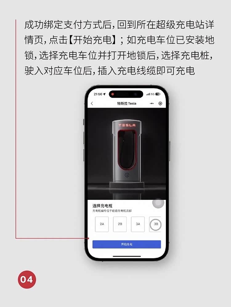 成功绑定支付方式后,回到所在超级充电站详情页,点击开始充电。如充电车位已安装地锁,选择充电车位并打开地锁后,选择充电桩,驶入对应车位后,插入充电线缆即可充电。