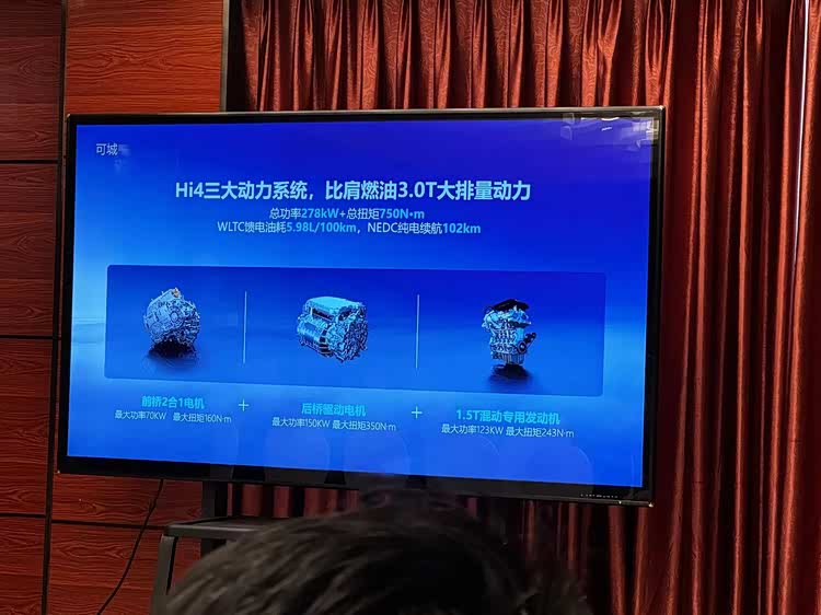外观、内饰方面就不多说了,新款与老款没有明显差异。主要说说这套Hi4混混动架构,在日常城市行驶和多种复杂场景中都能体现出其优势。在城市行驶过程中,车辆主要采用后电机驱动,即后驱行驶模式,这种模式下动力性能更强,提速更快更稳定。当需要急加速或超车时,车辆会切换为四驱模式,加速更快,最快可实现0-100km/h加速6.3秒。其前后双电机结构,车辆的轴荷比接近50:50,充分利用四轮抓地力,使得转向更敏捷,弯道行驶更稳定。在爬坡越障的场景中,车辆的重心会压在后轮,后轮的抓地力更强,不容易打滑。