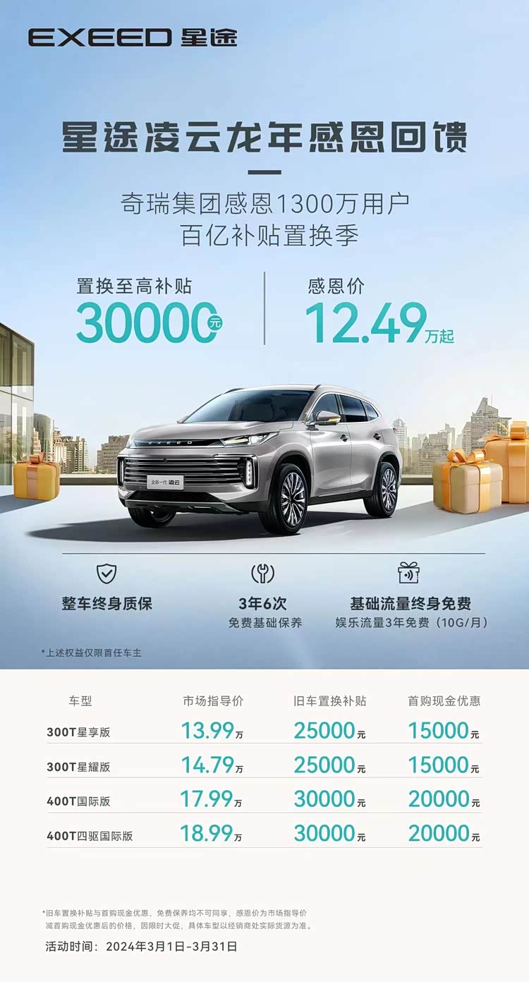 如果是手握20万购车预算,拿下星途凌云400T两驱国际版一方面是绰绰有余更省钱,另外还能拥有全面优秀于合资主流产品的越级体验与满足感,绝对是更物超所值的明智之举。况且,奇瑞集团感恩1300万用户百亿补贴置换季正在进行,星途凌云系列现购感恩价12.49万起,享置换补贴至高30000元,首购现金优惠至高20000元,全系高品质车型,感兴趣的朋友真的可以冲!