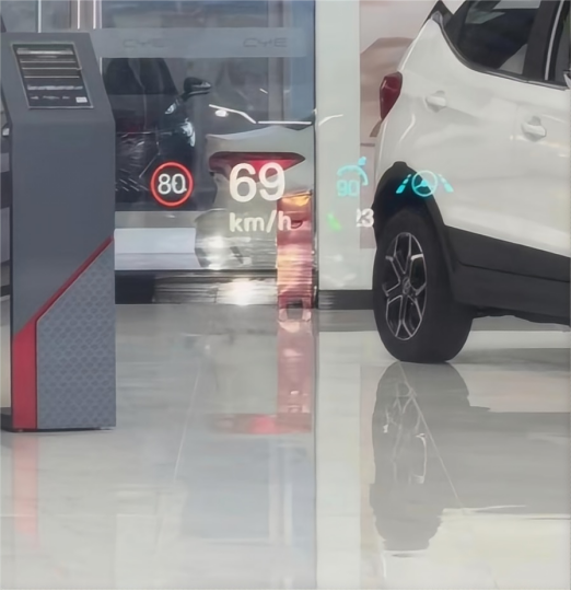 此外,平时开车的时候,我们如果想要看车速、能耗、续航等,就需要看液晶仪表盘,而一旦碰到拥挤路段,我们却看了一下仪表盘的话,就很容易因为一时的分神,发生追尾的风险。而HUD抬头显示系统能帮我们规避这个风险,打开本功能后,仪表盘上的车速、能耗等基础的信息,就能够以投影的方式,投射到驾驶员正前方的玻璃处,让驾驶员平视的时候都能看到基本的行车信息。这个功能在夜间是比较好用的,投影得比较清晰。而一旦到了阳光直射的中午,就会变得比较模糊,视觉效果就并不算好了。