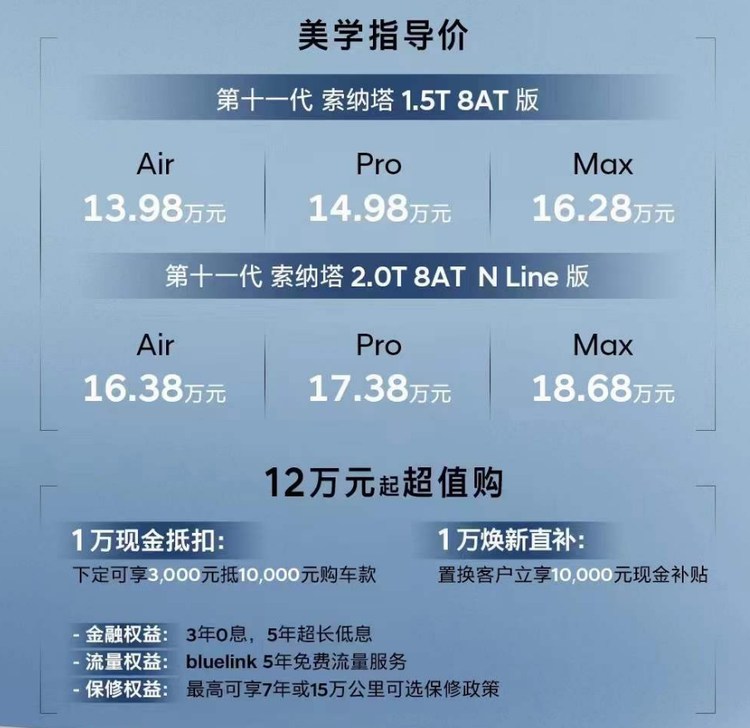 在价格方面,第十一代 索纳塔展现了传统燃油车在市场上的强大竞争力。与同级别的电动车相比,索纳塔在价格上更具优势。3月26日,第十一代索纳塔正式上市。新车共推出6款车型,官方指导价为13.98万至18.68万元。与此同时,北京现代还为购买第十一代索纳塔的用户提供多项专属福利政策,其中包括下定可享3000元抵10000元购车款;置换客户,立享10000元现金补贴;3年0息,5年超长低息的金融权益;bluelink 5年免费流量服务的流量权益;最高可享7年或15万公里可选保修政策的保修权益。这一价格定位无疑将使其在中级车市场中更具竞争力,相较于动辄二三十万元的电动车来说,这无疑为消费者提供了一个更为经济实惠的选择。