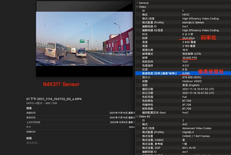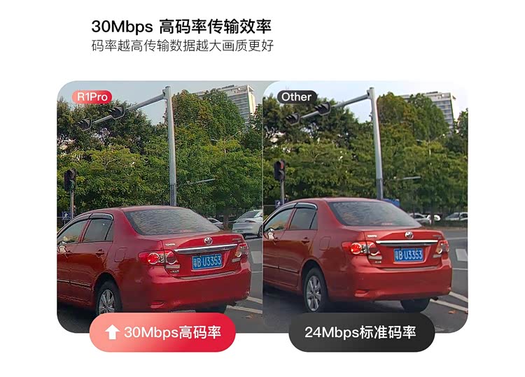 在众多的参数里面有几个是值得注意:处理器、运行内存、码率、帧率、容量支持、停车监控,这几项选择上需要重点关注的,它决定了行车记录仪的稳定性、可靠性以及实用性,先从处理器说起,处理器的主要作用是负责影片的编码生成,而运行内存主要是作为调度,所以运行内存越高机器的稳定性流畅度就越好,那么码率跟帧率还有容量是处理器决定的,处理器支持这么高的码率、帧率、还有容量储存,如果处理器不好,那么就无法获得更多的资源分配,就像码率只有25Mbps,帧率只有25fps,它们处理器的资源不够无法支持更高的参数,重点再讲解一下码率跟帧率,首先码率主要的作用是画质传输速率,传输速率越高画质就越好,因此清晰度重点要看码率的大小,而目前大部分4K产品最高支持25Mbps,这样会使得像素密度下降,画质降低,如果帧率也只有25fps不仅也会影响像素密度还会降低行车中车牌拍摄的难度,这样说有些枯燥,放几张比较看下就明白