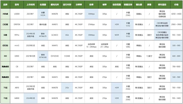 如果对没有太高的要求,预算有限的话,盯盯拍mini5、360 G900,价格在列表里面也算比较便宜,只不过功能比较多,适合对娱乐功能性有要求的,毕竟这两款功能都很类似,各种辅助功能,如果没有预算那可以直接上兴科威U3000,毕竟硬件实力摆在这,如果追求性价比、稳定性的那可以考虑云路R1Pro,也是个老品牌主要外贸出口,纯粹行车记录仪,没有太多的功能与兴科威U3000一样支持30Mbps的码率,还是很不错的选择,价位也没有比Mini5、G900贵多少,当然很多人也买新不买旧,那么从表格上来看的话也只有云路R1Pro跟70迈的M800是最新款,想买新款的也可以考虑一下,不过M800是内置储存并且只有25fps。