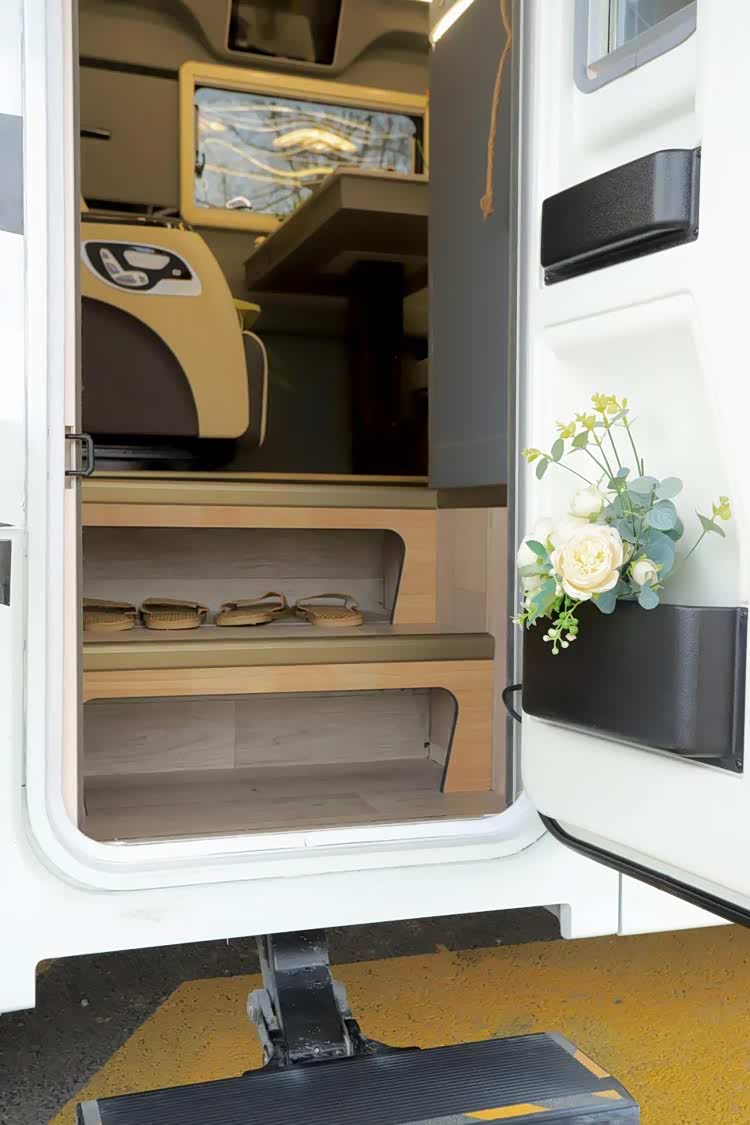 中门处设计有电动伸缩踏步、自动感应灯以及台阶储物格,空间得到了很好地利用。